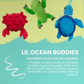 Conjunto de brinquedos para cães Snugarooz Lil Ocean Buddies com adesivo de reparo — pacote de 3 com caranguejo, tartaruga e sapo, pelúcia e sustentável — Feito com garrafas de água recicladas —