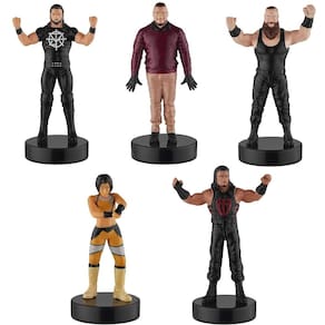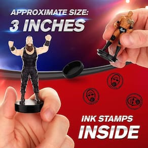 Torne-se parte da sensação Nada faz o sangue bombear como uma partida da WWE. Mergulhe no com o PMI! Seus selos da WWE permitem que você lute junto com seus favoritos com calças de selo autotintadas e blusas de bonecos de ação. Equos com tecnologia de autopintura, seus carimbos da WWE imprimem um toque de personalidade em qualquer projeto. Na parte inferior da figura, há um selo do rosto do campeão com tinta preta, vermelha, roxa ou azul suficiente para durar cerca de 200 selos. Fortaleça papéis timbrados, fortaleça os papéis escolares, decore artesanato e muito mais!