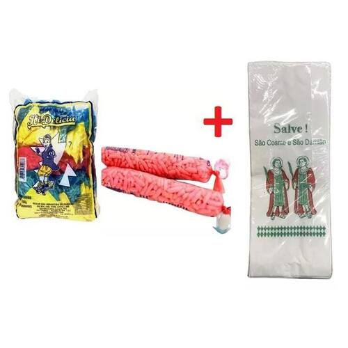 Contém: 1 pacote com 50un saquinhos Pipocas Flocos de Arroz Doce + 50 un saco de papel 9x27cm cosme e damião
