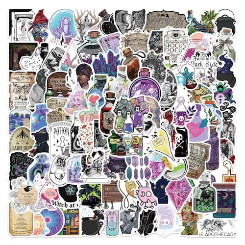 Material: papel e vinil Peso: 30-60 g Tamanho: 3-6 cm Quantidade: 100 unidades Pacote de adesivos Switchy Apothecary 100 unidades de adesivos exclusivos com frascos de poções, cristais, ervas, livros de feitiços, luas e designs místicos, perfeitos para adicionar vibrações góticas e mágicas. Vinil impermeável durável Feitos de material de PVC de alta qualidade, esses adesivos de vinil são à prova d'água, resistentes ao sol e a arranhões, garantindo cores vivas e durabilidade duradouras. Fácil de descascar e aplicar Cada decalque é pré-cortado e autoadesivo, o que o torna simples de usar em superfícies lisas; removível sem deixar resíduos pegajosos. Decoração criativa de bricolage. Ideal para decorar álbuns de recortes, diários, laptops, malas, guitarras, skates, garrafas de água e muito mais, dando um toque místico aos itens do dia a dia. Para adolescentes e adultos Perfeito para aqueles que amam a estética gótica, bruxa, farmacêutica ou fantástica; ótimo para estudantes, artistas e amadores criativos que gostam de uma expressão de estilo única.