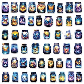Butterfly in Jar Fantasy Art — Cada adesivo apresenta ilustrações sonhadoras de borboletas dentro de potes brilhantes, cercados por estrelas, flores e iluminação suave, perfeitos para criações com temas mágicos. Material de vinil à prova d'água — Feito de vinil durável de alta qualidade, à prova d'água, resistente a arranhões e adequado para uso interno e externo. Versátil para muitas superfícies — Ideal para personalizar laptops, diários, garrafas de água, skates, malas, pára-choques de carros, capas de telefone, notebooks e muito mais. Forte adesão sem resíduos — Fáceis de descascar e aplicar, esses decalques aderem bem a superfícies lisas e podem ser removidos de forma limpa sem danificar a superfície. Perfeito para projetos de bricolage — com tamanho de 5 a 8 cm, este pacote é ótimo para decorar agendas, álbuns de recortes, embalagens ou criar uma atmosfera estética sonhadora.