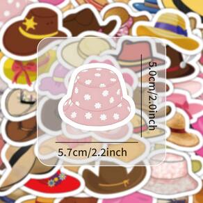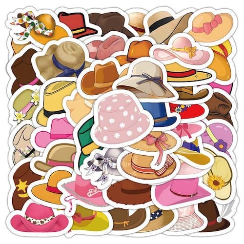 Desenhos vibrantes com temas de chapéus — Inclui 50 adesivos exclusivos em estilo de desenho animado com uma grande variedade de chapéus, como chapéus de sol, chapéus de balde, chapéus de cowboy, chapéus de chapéu e bonés de verão em cores fortes e suaves. Vinil impermeável durável — Feito de material de vinil de alta qualidade que é à prova d'água e resistente ao desbotamento, ideal para decorar superfícies internas e externas. Tamanho perfeito para uso versátil — Cada decalque mede de 5 a 8 cm, adequado para personalizar laptops, diários, garrafas de água, malas, skates e capas de telefone. Aplicação sem resíduos — os adesivos aderem com segurança e são removidos facilmente sem danificar as superfícies ou deixar resíduos pegajosos, o que os torna ótimos para decoração flexível. Ótimo para projetos pessoais e de bricolage — Perfeito para amantes de chapéus, artesãos de moda e fãs de diários que desejam adicionar um toque colorido e estiloso aos itens do dia a dia.