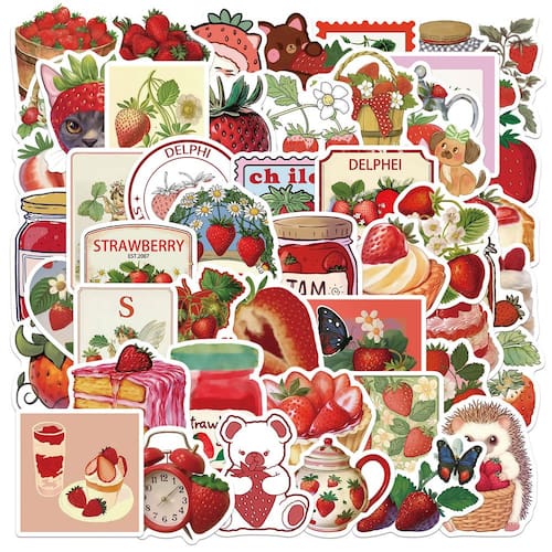 Material: papel e vinil Peso: 30-60 g Tamanho: 3-6 cm Quantidade: 50 unidades Tema de geleia de morango — Inclui morangos, potes de geleia, sobremesas, bolos e lindos elementos de frutas de desenhos animados para um estilo de decoração doce e criativo. Vinil impermeável durável — Feitos de material de vinil premium, à prova d'água e resistente ao sol, esses adesivos são removíveis sem deixar resíduos pegajosos. Amplas aplicações — Perfeito para laptops, diários, álbuns de recortes, garrafas de água, skates, malas, geladeiras, capas de telefone e projetos de bricolage. Estilo fofo e estético — Gráficos de frutas vermelhas brilhantes misturados com elementos de geleia e sobremesa atraem crianças, adolescentes e adultos que adoram designs divertidos. 50 adesivos exclusivos — cada pacote contém 50 decalques diferentes com temas de morango, oferecendo muitas opções para personalização pessoal de bricolage.