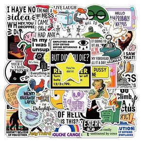 Material: papel e vinil Peso: 30-60 g Tamanho: 3-6 cm Quantidade: 50 unidades O pacote de humor sarcástico contém 50 adesivos com citações espirituosas, frases sarcásticas e desenhos animados divertidos para expressar humor e atitude de uma forma divertida. Vinil impermeável durável Feito de material de PVC premium com revestimento à prova d'água e resistente a UV, garantindo cores vibrantes que permanecem brilhantes e não descascam facilmente. Ampla aplicação. Perfeito para decorar laptops, álbuns de recortes, garrafas de água, skates, malas, capas de telefone, diários e outras superfícies lisas. Fácil de usar e remover O design peel-and-stick permite uma aplicação simples e uma remoção limpa sem deixar resíduos pegajosos nas superfícies. Ideal para adolescentes e adultosUma ótima opção para estudantes, funcionários de escritório e amantes do humor que gostam de decoração sarcástica e criativa para seus pertences.