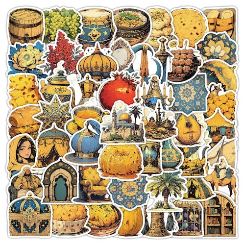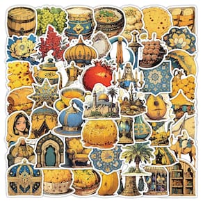 Material: papel e vinil Peso: 30-60 g Tamanho: 3-6 cm Quantidade: 50 unidades Coleção temática do Oriente Médio — Inclui 50 peças de adesivos de vinil com cúpulas, lanternas, romãs, conjuntos de chá, comidas tradicionais, arquitetura e motivos culturais. Vinil impermeável durável — Feito de PVC de alta qualidade, impermeável, resistente ao sol e à prova de desbotamento, mantendo os adesivos vibrantes e duradouros em ambientes internos ou externos. Fácil de usar e remover — O adesivo forte garante uma fixação firme, mas descasca de forma limpa sem deixar resíduos pegajosos, adequado para superfícies lisas. Desenhos artísticos e culturais — Ilustrações retrô em estilo cartoon inspiradas na cultura do Oriente Médio, perfeitas para amantes da arte, viajantes e entusiastas do diário. Amplas aplicações — Ideal para decorar laptops, diários, álbuns de recortes, garrafas de água, skates, cadernos, malas e telefones.