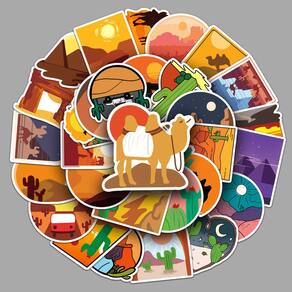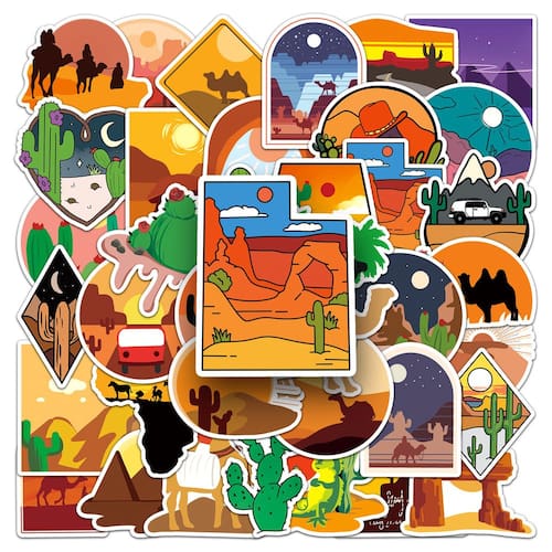 Arte vívida com tema do deserto — apresenta 50 decalques de vinil exclusivos com paisagens desérticas brilhantes, camelos, cactos, pôr do sol e elementos cênicos em um estilo de desenho animado divertido que agrada tanto às crianças quanto aos criativos. Material durável e impermeável — Feito de vinil de alta qualidade, cada decalque é à prova d'água, resistente às intempéries e não desbota facilmente, o que os torna perfeitos para uso interno e externo. Perfeito para personalizar tudo — Ideal para decorar laptops, diários, garrafas de água, capas de telefone, malas, capacetes e muito mais. Adicione uma atmosfera desértica aos seus itens favoritos. Fácil de aplicar e remover — Esses decalques são simples de descascar e colar. Eles aderem com segurança à maioria das superfícies lisas e podem ser removidos sem danificar a superfície ou deixar resíduos pegajosos. Dimensionado para versatilidade — Cada adesivo varia de 5 a 8 cm, o que o torna o tamanho perfeito para colocar em camadas em álbuns de recortes, decorar agendas ou adicionar toques divertidos ao material escolar.
