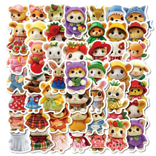 Material: papel e vinil Peso: 30-60 g Tamanho: 3-6 cm Quantidade: 50 unidades 50 designs exclusivos Inclui 50 adesivos de animais não repetitivos em estilo pelúcia com ursos, coelhos, hamsters e outros adoráveis personagens de desenhos animados em roupas coloridas. Vinil de alta qualidade Feitos de material de vinil premium, esses decalques são à prova d'água, duráveis e resistentes ao desbotamento, garantindo cores brilhantes de longa duração. Decoração versátil Perfeita para personalizar laptops, álbuns de recortes, cadernos, skates, capas de telefone, garrafas de água, malas, capacetes e muito mais. Easy Peel & StickEsses adesivos de vinil podem ser aplicados facilmente em qualquer superfície lisa e removidos sem deixar resíduos pegajosos, seguros para uso por crianças e adolescentes. Estilo fofo e estéticoAs cores brilhantes e os animais de desenho animado inspirados em pelúcia os tornam divertidos para crianças, adolescentes e amantes de animais personalizarem material escolar e artesanato.