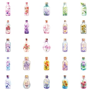 Tema romântico floral em garrafa — Este pacote inclui 50 adesivos exclusivos com garrafas de vidro de estilo vintage cheias de rosas, margaridas, lírios, girassóis e outros belos arranjos de flores. Vinil impermeável durável — Feitos de vinil de alta qualidade, esses decalques são à prova d'água, resistentes a arranhões e duradouros — perfeitos para decorar superfícies internas e externas. Ótimo para decoração estética e bricolage — Ideal para diários, laptops, copos, capas de telefone, garrafas de água, cadernos, álbuns de recortes, agendas e projetos de artesanato. Fácil remoção de descascar e limpar — Esses adesivos são fáceis de aplicar e remover sem deixar resíduos, o que os torna ideais para personalizar e atualizar seus itens livremente. Tamanho perfeito para uso criativo — Cada peça mede de 5 a 8 cm, perfeita para sobrepor, colar, rotular e adicionar beleza botânica a qualquer espaço de trabalho criativo.