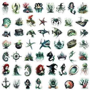 Dark Mermaid & Fantasy Ocean Theme — Este pacote de adesivos apresenta 50 designs exclusivos de sereias góticas, bruxas marinhas, castelos, âncoras, criaturas marinhas e cenas místicas de corais em um estilo artístico e sombrio. Material de vinil premium — Feito de vinil de alta qualidade que é à prova d'água, resistente ao desbotamento e durável, perfeito para decoração interna e externa em superfícies planas e lisas. Uso versátil e fácil de descascar — Cada decalque é cortado individualmente e fácil de descascar e aplicar, adequado para laptops, garrafas de água, skates, tablets, capas de telefone, diários, espelhos e muito mais. Design estético transparente — apresenta bordas translúcidas para uma mistura perfeita em diferentes fundos, aumentando o impacto visual em superfícies claras ou claras, como vidro ou plástico. Perfeitos para decoração criativa de bricolage — Se você está decorando seus artigos de papelaria, acessórios ou equipamentos diários, esses decalques de sereia de fantasia sombria oferecem um toque de charme subaquático misterioso.