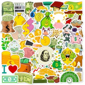 Pacote de adesivos, moedas de ouro, colares, dinheiro para laptop e muito mais