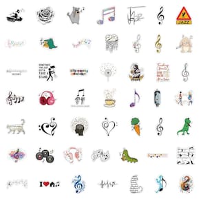 Material: papel e vinil Peso: 30-60 g Tamanho: 3-6 cm Quantidade: 50 unidades O design do tema musical Inclui 50 adesivos com notas musicais, teclas de piano, guitarras, saxofones e toca-discos, perfeitos para amantes da música e projetos criativos. Material de vinil durável Feitos de vinil premium, esses decalques são à prova d'água, resistentes a rasgos e removíveis sem deixar resíduos pegajosos, ideais para uso a longo prazo. Ampla gama de aplicações Ótimo para decorar laptops, garrafas de água, cadernos, skates, álbuns de recortes, capas de telefone, malas, instrumentos e muito mais. Estilo clássico em preto e brancoO design monocromático elegante com toques coloridos ocasionais confere aos seus itens uma aparência chique, artística e atemporal. Fácil de descascar e colar Os adesivos pré-cortados estão prontos para uso — basta descascar e colar para personalizar seus itens, ótimos para entusiastas de bricolage e estudantes de música.