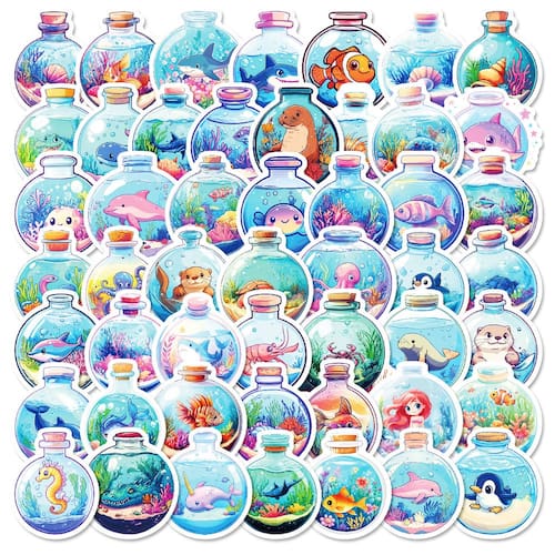 Adoráveis designs de mundos subaquáticos — Inclui 50 adesivos com encantadores animais marinhos, como golfinhos, baleias, lontras, pinguins, peixes e recifes de coral, selados em garrafas redondas coloridas. Vinil impermeável durável — Feitos de material de vinil premium, esses decalques são à prova d'água, resistentes a arranhões e duradouros, perfeitos para o uso diário em várias superfícies. Perfeito para personalização criativa — decore seu laptop, álbum de recortes, capa de celular, garrafa de água, diário, mala ou agenda com esses adesivos de garrafa com tema oceânico para dar um toque de cor. Fácil de usar e remover de forma limpa — os adesivos se soltam facilmente e aderem bem à maioria das superfícies lisas. Eles podem ser removidos sem deixar resíduos pegajosos. Tamanho ideal para projetos de bricolage — Com tamanhos que variam de 5 a 8 cm, eles são perfeitamente dimensionados para planejadores, embalagens, artesanato, acessórios tecnológicos e decoração criativa para crianças.