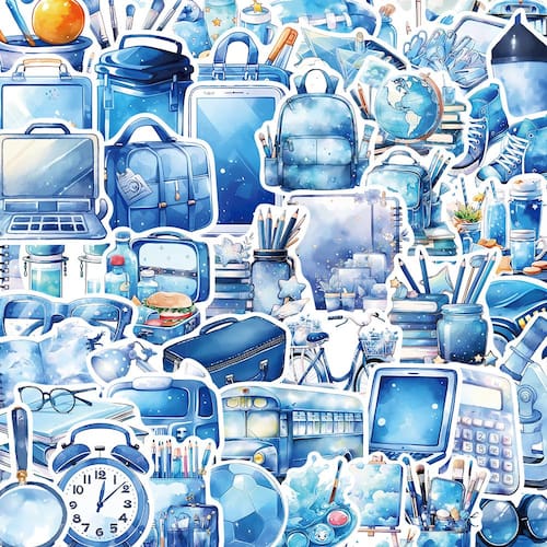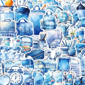 Material: papel e vinil Peso: 30-60 g Tamanho: 3-6 cm Quantidade: 50 unidades Tema azul estético — Possui 50 adesivos exclusivos com tema azul, incluindo mochilas, livros, relógios, globos, ônibus, laptops, potes e ferramentas de pintura para uma aparência elegante e coordenada. Impermeável e durável — Feito de material de vinil de alta qualidade que é à prova d'água, resistente a rasgos e à prova de sol para manter seus designs vibrantes e duradouros. Design Peel and Stick — Fácil de aplicar em superfícies lisas, como laptops, notebooks, garrafas de água, capas de telefone, skates e diários; remove de forma limpa e sem deixar resíduos. Perfeito para estudantes e criadores — Ótimo para crianças, adolescentes, professores e amantes de papelaria para personalizar itens escolares, planejadores, projetos de arte e decoração de quartos. Tamanho conveniente — Cada decalque mede cerca de 5 a 8 cm, é leve e portátil, o que os torna ideais para decorar várias superfícies ou carregar em um estojo de lápis.