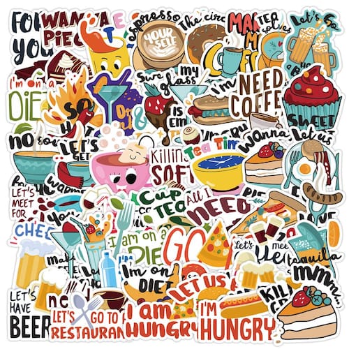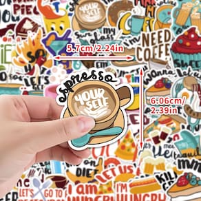 Material: papel e vinil Peso: 30-60 g Tamanho: 3-6 cm Quantidade: 50 unidades Tema criativo de alimentos 50 peças de adesivos em estilo cartoon com café, chá, pizza, hambúrgueres, cerveja, bolo, cupcakes e citações divertidas relacionadas a alimentos em cores vibrantes. Material de vinil durável Vinil de PVC impermeável de alta qualidade, resistente à luz solar, arranhões e água, garantindo um uso decorativo duradouro. Ampla aplicação Perfeita para laptops, garrafas de água, diários, álbuns de recortes, capas de telefone, malas, skates e outros projetos de bricolage. Fácil de usar O adesivo forte facilita a aplicação dos adesivos em superfícies lisas, removíveis sem resíduos pegajosos. Diversão para todas as idades. Adequado para adolescentes, estudantes e adultos que adoram designs com temas gastronômicos e gostam de personalizar itens pessoais com decalques estilosos.