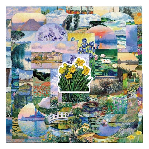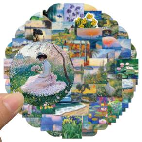 Material: papel e vinil Peso: 30-60 g Tamanho: 3-6 cm Quantidade: 56 unidades Tema artístico de pintura a óleo — Contém 56 adesivos exclusivos inspirados nos estilos de arte impressionista e clássico, com flores, jardins, rios e paisagens cênicas. Designs elegantes e estéticos — Texturas vívidas de pinceladas e padrões de arte coloridos trazem uma atmosfera artística vintage e elegante aos seus pertences. Durável e impermeável — Feito de vinil de alta qualidade com revestimento à prova d'água e resistente ao desbotamento, garantindo um uso vibrante e duradouro em ambientes internos e externos. Amplas aplicações — Perfeitas para laptops, capas de telefone, diários, álbuns de recortes, garrafas de água, malas e projetos de decoração artística DIY. Fácil de aplicar e remover — O adesivo forte mantém os decalques no lugar, mas pode ser removido sem deixar resíduos pegajosos em superfícies lisas.