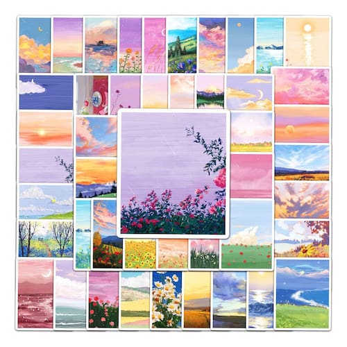 Material: papel e vinil Peso: 30-60 g Tamanho: 3-6 cm Quantidade: 50 unidades Tema de paisagem artística — Inclui 50 adesivos exclusivos com paisagens em estilo de pintura a óleo com pôr do sol, flores, montanhas, oceanos e céus oníricos. Estética e colorida — Tons pastel brilhantes e obras de arte detalhadas em estilo pincel criam uma atmosfera fresca e relaxante, perfeita para diários e projetos criativos. Durável e impermeável — Feito de vinil de alta qualidade com revestimento à prova d'água e resistente ao sol, garantindo cores vivas e uso duradouro em ambientes internos ou externos. Aplicação multiuso — Ótima para decorar laptops, capas de celular, skates, garrafas de água, diários, álbuns de recortes e malas. Fácil de aplicar e remover — O adesivo permite que os adesivos grudem com firmeza e são removíveis sem deixar resíduos pegajosos.