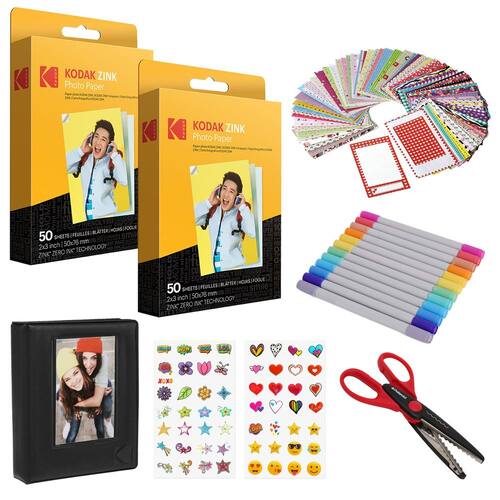 Kodak Pacote com 100 scrapbook de papel Zink premium, 5 x 7,5 cm - Detalhes incrivelmente vibrantes – Papel fotográfico de qualidade premium recria todas as cores e momentos memoráveis com detalhes excepcionais e brilhantes. Cada imagem apresenta uma integridade de cor notável que é perfeita para imprimir fotos de smartphones ou fotos de redes sociais - Fotos – o papel zink elimina a necessidade de filmes caros e desperdício de cartuchos. A tecnologia Zero ink é uma solução de impressão natural que é fácil de carregar em sua câmera e imprimir em uma única passagem - Impressões à prova de vida – o papel zink é tratado com um sobretudo de polímero protetor brilhante que é resistente à água, resistente a rasgos, à prova de manchas e seco ao toque - Memórias que duram uma vida inteira – especialmente feitas para serem impressões de zink de longa duração são resistentes ao desbotamento mesmo quando expostas ao calor leve e à umidade - O que você recebe 100 folhas Kodak 5 x 3 pol. Papel ZINK 12 marcadores, pacote com 100 adesivos de borda para fotos, 6 tesouras de borda decorativas, conjunto de 50 adesivos 6 fitas Washi