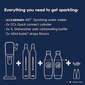SodaStream Conjunto Art Sparkling Water Maker (preto), com CO2, garrafas DWS e sabores de gotas de bolhas - Faça água com gás fresca com o apertar de um botão. - Inclui: máquina de água com gás, (2) cilindros de CO2 de 60 L, (1) pacote duplo de garrafa lavável na lava-louças e (2) sabores de gotas de bolhas de 40 ml - Eficiência energética, alimentado por cilindro de CO2. Cada cilindro de CO2 carbonata até 60 litros de água. - Inserção de garrafa de encaixe fácil de usar para carbonatação rápida - Compatível com todos os sabores SodaStream e garrafas de carbonatação SodaStream (sem BPA e melhor para o planeta), exceto a garrafa de vidro SodaStream - SodaStream As máquinas de arte são compatíveis apenas com o cilindro de CO2 SodaStream Quick Connect