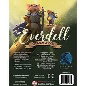- Atualize sua edição padrão do Everdell para a Edição de Colecionador com o Pacote de Atualização Glimmergold. Glimmergold adiciona ao seu jogo todos os componentes incluídos na Edição de Colecionador: Extra! Extra! Cartas, cartas lendárias, regras para cartas da edição de colecionador, cartas Rugwort, Rat Workers, conjunto aprimorado de fichas de pontos de vitória, fichas “ocupadas” aprimoradas, dado aprimorado de 8 lados. É necessário o Everdell Base Game para jogar.