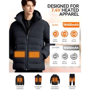 Pacote de bateria de colete aquecido de 18400 mAh 7,4 V para ORORO, para Venustas, bateria de 7,4 V para colete aquecido, com visor de LED, carregador portátil para colete, jaqueta, calça (não para dispositivos aquecidos de 5V) - Bateria exclusiva para roupas aquecidas: nosso carregador portátil de 7,4 V 3A foi projetado especificamente para roupas aquecidas. (colete aquecido, jaqueta aquecida, calça aquecida) Nossa bateria para colete aquecido é compatível com a maioria dos coletes aquecidos de 7,4 V no mercado (Observação: compatível com roupas aquecidas ORORO e Venustas, não para dispositivos aquecidos de 5 V) - GRANDE CAPACIDADE E TELA DE LED: 18400mAh pacote de bateria de jaqueta aquecida de grande capacidade, com um tempo máximo de aquecimento de 14 horas para atender ao seu uso diário. O tempo de aquecimento é: nível alto/7 horas, nível médio/11 horas, nível baixo/14 horas. Pode ser utilizado como uma bateria de colete extra aquecido, mantém você aquecido em todos os momentos no inverno frio. Visualize instantaneamente o status de carga com indicadores LED claros, garantindo que você esteja sempre no controle da energia do seu dispositivo - 2 cabos adaptadores CC: para que você aproveite melhor nossa bateria de colete aquecido, fornecemos 2 cabos adaptadores de 4,0 mm a 3,5 mm e 3,8 mm para evitar os inconvenientes causados por portas incompatíveis. O modelo de interface CC da bateria é: 4,0 mm. Se o modelo da porta de saída CC de suas roupas aquecidas for de 4,0 mm, como para roupas aquecidas ORORO, não há necessidade de usar um cabo adaptador e você pode usar nossas baterias diretamente. Mas se o modelo da porta de saída CC de suas roupas aquecidas for de 3,5 mm/3,8 mm (como: para roupas aquecidas Venustas), então você precisa usar o cabo adaptador DC - Proteção múltipla de segurança: usamos a versão mais recente de polímero de lítio de alta qualidade, que é certificado UL/CE e equipado com um design de segurança para proteger seu dispositivo contra sobretensão, sobrecorrente, sobrecarga, curto-circuito e sobredescarga, garantindo sua segurança. - O que você recebe: carregador portátil de 1 x 18400 mAh para colete aquecido, 2 adaptadores DC, 1 cabo tipo C; 1 manual do usuário e nosso atendimento ao cliente amigável 24h. Se você tiver algum problema, e resolveremos o nosso melhor