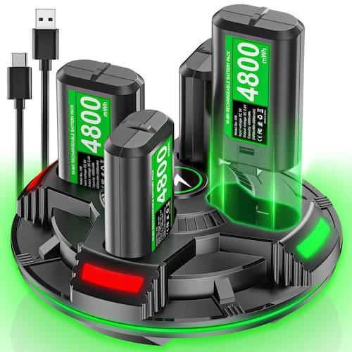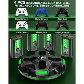 - 4 x 4800mWh PARA XBOX PACOTE DE BATERIA RECARREGÁVEL: essas baterias recarregáveis para controle Xbox são compatíveis com Xbox Series S/Xbox Series X/Xbox One/Xbox One S/Xbox Controladores sem fio One X/Xbox One Elite, equipados com 4 baterias recarregáveis de grande capacidade de 4800 mWh para controladores Xbox e um carregador rápido de bateria para Xbox. A bateria do controlador xbox one tem vários métodos de carregamento, incluindo console, PC, hub USB, etc. (observado: não menos que 5V2A)