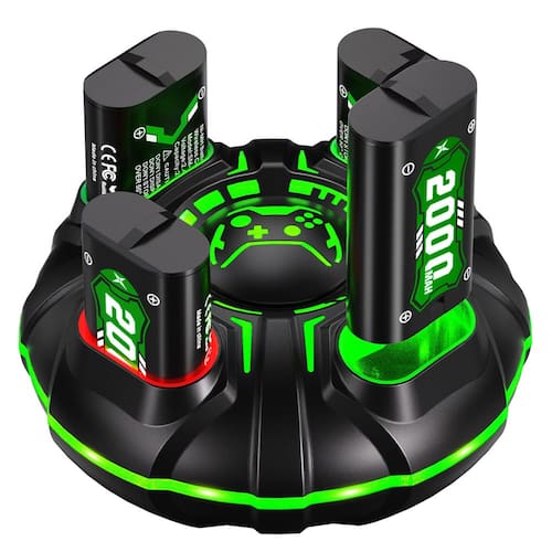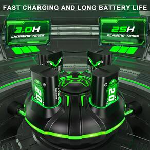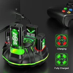 Por que escolher nosso pacote de bateria do controlador Xbox? -?Pacote com 4 baterias recarregáveis Xbox de 2000mAh (4800mWh)?Esta bateria de controle Ukor xbox leve e portátil vem com quatro baterias recarregáveis de 2000mAh (4800mWh), um cabo de carregamento e uma base de carregamento para Xbox. Ele fornece energia abundante para os controladores Xbox One, Xbox One S, Xbox One X e Xbox One Elite, para que você não precise mais se preocupar com interrupções no meio do jogo. -?Diversão ininterrupta no jogo?A bateria recarregável Ukor Xbox vem com quatro baterias recarregáveis que podem ser totalmente carregadas em 3 horas. Cada bateria foi projetada para ser usada até 2.000 vezes e pode fornecer mais de 15 horas de tempo de jogo. Com essas quatro baterias Xbox recarregáveis de alta capacidade, você pode aumentar significativamente seu tempo de jogo durante reuniões familiares e festas de jogos, criando memórias inesquecíveis para seus entes queridos e amigos. -?Bateria segura do controlador Xbox?Nossa bateria do controlador Xbox Series X vem com um sistema integrado à prova de explosão, fornecendo proteção contra sobretensão, sobrecorrente, superaquecimento e curto-circuito. Você pode carregar a bateria do Xbox com segurança antes de dormir ou sair e continuar jogando ao acordar ou voltar para casa! O design de encaixe mantém a bateria no lugar certo dentro da estação de carregamento da Série Xbox, mesmo que ela seja sacudida ou virada. -?Design de aparência elegante e prático?Esta bateria Xbox Ukor apresenta um design patenteado de nave espacial bacana. Cada porta de carregamento tem sua própria luz indicadora LED independente, facilitando a verificação do status de carregamento de cada bateria pelos usuários. Durante o carregamento, as luzes LED ficam vermelhas e ficam verdes quando totalmente carregadas. A caixa do carregador permanece verde quando conectada a uma fonte de alimentação, o que, junto com a iluminação ambiente, adiciona uma sensação de atmosfera e imersão ao jogar. -?Por que escolher a bateria Ukor?Esqueça as baterias descartáveis! Economize dinheiro e ajude o meio ambiente com nossas baterias recarregáveis. Na Ukor, a satisfação do cliente é nossa maior prioridade. Se você enfrentar algum problema com sua bateria recarregável Ukor Xbox dentro de um ano após a compra, imediatamente. Oferecemos serviço de devolução com garantia de 1 ano. -?NOTA?Ao carregar, insira a bateria com o lado de 2000mAh voltado para fora no carregador. Ao inserir a bateria, pressione a bateria com a força apropriada para garantir que a bateria esteja totalmente carregada no carregador.