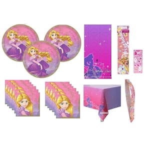 Pacote de festa Rapunzel emaranhado para 16 inclui 16 pratos de papel de almoço 23 cm, 16 guardanapos de papel de almoço 16,5 cm, 1 capa de mesa de plástico 137 x 259 cm, 1 faixa de aniversário, 1 folha de adesivo de princesa (não adesivos emaranhados). - Pacote de festa Rapunzel emaranhado para 16 inclui: - 16 pratos de papel de almoço 23 cm, - 16 guardanapos de papel para almoço de 16,5 cm, - 1 toalha de mesa de plástico 137 x 259 cm, - 1 faixa de aniversário, 1 folha de adesivo de princesa (não adesivos emaranhados).