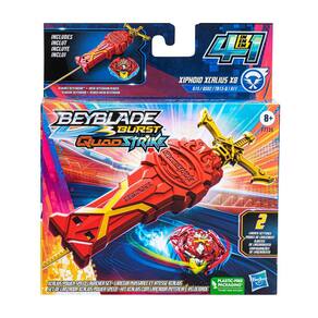 - Inclui um Beyblade Burst QuadStrike Xiphoid Xcalius X8 G15 QS02 TB13-Q A11 Right Turn Top. O giroscópio pode ser configurado para modo Core e Expert ou modo Core+ e Expert+