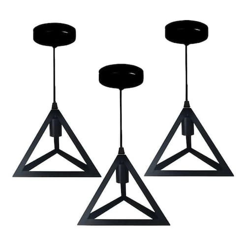 Pacote X3 de luminárias pendentes modernas Luminária pendente Dining Pyramid. Feito de forma artesanal, ele se presta magnificamente à decoração residencial e também às necessidades de iluminação de restaurantes ou empresas. Possui um anel que se desenrosca e permite ajustar o cabo na medida desejada, reduzindo-o ou adicionando mais cabos. É compatível com a grande maioria dos frascos convencionais. Projetado para decorar todos os tipos de ambientes. Especificações:. Forma da tela da lâmpada: Pirâmide. Dimensões da lâmpada: 23x25 cm. Comprimento do cabo: 90 cm. Diâmetro da base do teto: 9,6 cm. Tipo de soquete: E27. Tamanho do soquete: 7cm x 5cm Material aproximado: Metal. Tensão: 220v. Cor: Preto** NÃO INCLUI AMPOLLET ** Conteúdo do pacote: 3 x Abajur Pyramid 3 x E273 Soquete x Roof BaseInstalação de acessórios