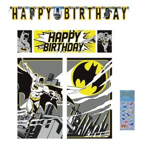 O pacote de suprimentos para festas de aniversário do Batman inclui 1 banner de feliz aniversário e 1 pano de fundo fotográfico Scene Setter. O banner tem 5,25 pés de comprimento. O Scene Setter Photo Backdrop inclui um conjunto de 5 peças que inclui 2 peças 32,5" x 59", 1 peça 44,50" x 16", 2 peças 10,25" x 16". - O pacote de suprimentos para festas de aniversário do Batman inclui: - 1 banner de feliz aniversário de 5,25 pés de comprimento; - 1 pano de fundo fotográfico Scene Setter inclui 2 peças de 32,5 “x 59", 1 peça de 44,5 “x 16", 2 peças de 10,25 “x 16".