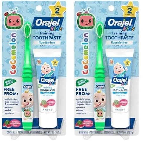 Orajel CoComelon Pacote de treinamento infantil alimentado por bateria com pasta de 30 ml e escova manual (pacote com 2) - As informações abaixo são apenas por pacote - Limpa suavemente e eficazmente dentes e gengivas: o creme dental de treinamento Orajel ajuda a remover alimentos e placas com escovação para dentes mais limpos. - Pasta de dente de treinamento sem flúor: nossa fórmula sem flúor é segura se ingerida quando usada conforme as instruções. - Sabor natural de melancia: ótimo sabor ajuda a incentivar a escovação. As crianças adoram o sabor! - Ingredientes 100% de fonte natural: livre de parabenos, açúcar, glúten, silicones, álcool, lauril sulfato de sódio (SLS), laticínios, aspartame e conservantes artificiais, cores, corantes adoçantes - COCOMELON: Torne o aprendizado de hábitos saudáveis de escovação divertido com Orajel pasta de dente! Deixe JJ participar da rotina diária de seus filhos!