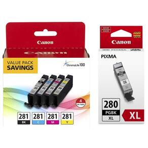 Contendo cartuchos de tinta preta, ciana, magenta e amarela, este pacote econômico Canon CLI-281 BKCMY de 4 cores ajudará você a garantir que você tenha um novo conjunto de tintas à mão caso você fique seco. O tanque de tinta preta Canon PGI-280 XL é utilizado para imprimir documentos em papel comum e garante texto nítido e nítido.
