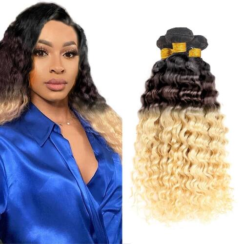 - ? Cor de cabelo cacheado crespo ombre?: Pacotes T1B/4/613, mechas ombré de três tons, mechas de cabelo humano marrom e loiro.