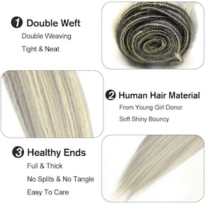 Especificações do cabelo: 1. Material do cabelo: Cabelo humano virgem brasileiro não processado grau 8A. 2. Qualidade do cabelo: trama dupla à máquina, feixes grossos saudáveis, sem emaranhados ou quedas. 3. Tipo de cabelo: mechas de cabelo humano liso. 4. Cor do cabelo: Dois tons Pcinza/613 (cinza loiro misto). 5. Comprimento do cabelo: mechas de 30 a 86 cm, mechas grossas saudáveis, tamanhos diferentes podem atender a diferentes necessidades de cabelo. 6. Peso do cabelo: 95-100 g/feixe, geralmente 3-4 mechas de cabelo humano podem deixar o cabelo cheio. 7. Ocasião: Adequado para diferentes ocasiões, uso diário, reuniões, viagens, shows, cerimônias de formatura, casamentos, encontros e assim por diante, pode trazer mais beleza e mais charmoso! Perguntas frequentes: P1: Como reduzir o emaranhamento ou o desprendimento? A1: Cruze os dedos, desconecte a ponta, penteie suavemente o cabelo com as mãos ou penteie o cabelo. Use condicionador para torná-lo macio e suave. Não use uma escova ou force para puxar o cabelo P2: Como lavar? Posso molhá-lo? A2: Sim, claro. Você pode lavar o cabelo regularmente com xampu em água morna, adicione um pouco de condicionador à água morna e esfregue o cabelo suavemente enquanto lava, absorva o excesso de água e penteie e deixe secar naturalmente, não exponha à luz solar. P3: Quantos pacotes eu preciso para a cabeça inteira? R3: Cerca de 3 ~ 4 mechas de cabelo humano, curto então 3 mechas de 45,7 cm são suficientes, maiores do que 45,7 cm 4 mechas seriam melhores. - ?Material de cabelo humano Pgray/613?Cabelo humano virgem brasileiro 100% não processado. Macio e sedoso. Parece muito natural, assim como seu próprio cabelo. - ?Tipo e cor do pacote de cabelo? Cabelo humano liso. Cor cinza/613, cinza de dois tons misturado com loiro. - ?Vantagem do conjunto de destaques? Feixes de cabelo humano de trama dupla à máquina, é apertado e arrumado. Muito grossa, sem emaranhamento, sem queda, cabelo saudável, muito macio e bonito. - ?Peso e comprimento do cabelo? 30-86 cm, 95-100 g/mecha. - ?Adequado para qualquer ocasião?Perfeito para uso diário, reuniões de amigos, celebrações de férias, compras e encontros, e assim por diante. Se você tiver alguma dúvida, sinta-se à vontade para entrar em contato conosco a qualquer momento.