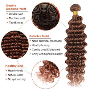 ZevPiul Hair Bundles~Mais bonito e confortável! Especificações do cabelo: 1. Material: 100% cabelo humano brasileiro não processado. 2. Textura: Pacotes de ondas profundas, feixes molhados e ondulados. 3. Tipo de cabelo humano: Cabelo humano Remy brasileiro. 4. Qualidade do cabelo: trama usinada dupla, sem emaranhamento, sem queda, sem cheiro. 5. Cor do cabelo: Feixes de cabelo humano profundo castanho, castanho avermelhado médio. 6. Comprimento do cabelo: mechas de cabelo de 30 a 86 cm (estique o cabelo liso e depois meça.) 7. Peso do cabelo: 3 mechas, 100 g/pacote, 300 g no total. 8. Ocasião: Perfeito para uso diário, Halloween, shows, festas temáticas, casamentos, encontros e assim por diante. Perguntas frequentes: P1: Quantos mechas eu preciso para uma cabeça inteira? R1: Normalmente, 3 mechas são suficientes para fazer uma cabeça inteira, mas se você quiser parecer mais longo ou mais cheio, 4 mechas podem ser uma escolha melhor. P2: O cabelo pode ser permanente? A2: pode ser alisado e recortado como desejar, mas tenha cuidado para não exceder 51 °C, caso contrário, danificará o cabelo. P3: Por que a trama do cabelo cai? R3: Assim como nosso cabelo normal, haverá uma pequena perda de cabelo quando o manusearmos com nossas mãos, o que exige que usemos corretamente. P4: Como evitar emaranhamento ou queda de cabelo? A4: Suas extensões de cabelo podem ficar emaranhadas devido à secura, acúmulo de gordura e sujeira. Lave o cabelo com um bom xampu e condicionador e penteie suavemente o cabelo com os dedos. Certifique-se de limpar e aparar pelo menos uma vez por semana. Lembrete: 1. Lave o cabelo regularmente. 2. Desembarace o cabelo suavemente antes de lavar. Não esfregue ou torça. 3. Adicione xampu suave à água fria e mexa o cabelo até limpar. Enxágue completamente. - ?Material dos feixes de cabelo humano?: mechas de cabelo humano virgem brasileiro não processado, cabelo humano ondulado profundo, macio e saudável para costurar ou perucas. - ?Vantagem dos pacotes de cor nº 30?: trama de máquina dupla, justa e limpa, queda mínima, sem emaranhamento, sem cheiro, fácil de cuidar, dura mais. - ?Cor marrom com ondas profundas?: Os pacotes são de cor pura 30, marrom claro. Pode ser alisado, enrolado, estilizado como seu próprio cabelo. - ?Peso e comprimento do cabelo?: 95-105 g/mechas, (cerca de 93 a 99 g/peça), 20 a 76 cm, múltipla escolha, peso total e fiel ao comprimento. - ?Mais bonito?: perfeito para uso diário, Halloween, Natal, shows, festas temáticas, casamentos, encontros e assim por diante, deixa você mais bonita e confiante!