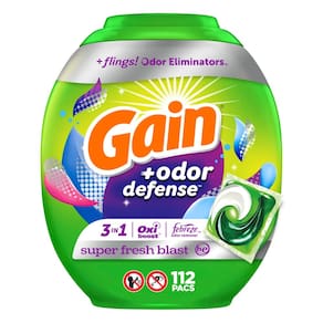 Pacotes de sabão em pó Gain Flings com defesa contra odores, aroma super fresco, 112 unidades, cápsulas 3 em 1 com Febreze e Oxi -