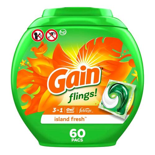 Gain Flings! Sabonete detergente para roupas compatível com HE 60 ct perfume de longa duração Island Fresh