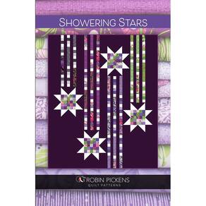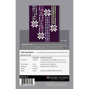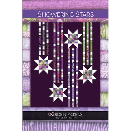 O padrão de colcha Showering Stars ilumina o céu com um design compatível com Jelly Roll. Esta colcha de tamanho duplo mede 75 polegadas x 90 polegadas e se encaixa rapidamente para uma colcha dramática. A imagem mostrada usa tecido Robin Pickens Sweet Pea & Lily, mas o padrão pode ser feito com qualquer coleção de tecidos.
