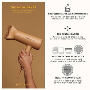 Experimente a liberdade e versatilidade do estilo com o secador de cabelo PATTERN de alto desempenho projetado para cabelos cacheados, cacheados e com textura firme. Equipado com um potente motor CA que reduz o tempo de secagem e um gerador de íons para suavizar a cutícula. Esta ferramenta quente inclui 4 acessórios exclusivos para ajudar a moldar, esticar, suavizar e definir. Acessório do difusor. Simulando secagem natural, o difusor possui pontas longas e ventiladas que distribuem uniformemente o ar da raiz às pontas, e uma placa de alumínio que irradia calor para ajudar a secar os cachos rapidamente. A forma de vórtice permite o fluxo de ar controlado, esteja você seccionando suavemente os fios ou difundindo as raízes com a cabeça para baixo. Acessório de pente de dente largo: resistente, mas gentil em fios delicados, o acessório de pente de dente largo imita o design do pente de dentes largos da PATTERN, permitindo deslizar sem esforço através de cachos e bobinas molhados ou secos, desembaraçando suavemente com garras largas enquanto garante uma distribuição uniforme do calor. Acessório da escova: enraizado no design da nossa premiada escova de chuveiro, o acessório de escova pesada é ótimo para secar e esticar bobinas e texturas apertadas, bem como comprimentos mais curtos. As cerdas desembaraçam e alisam o cabelo enquanto o calor seca sem esforço, e o resultado é um estilo estourado em menos tempo. Bocal concentrador: obtenha explosões estilo salão com o acessório do bocal concentrador. Direcionando o calor em cada seção do cabelo, o fluxo de ar focado permite que você trabalhe em seções pequenas ou grandes, esteja usando uma escova redonda para uma aparência elegante ou usando o secador nas raízes para alcançar volume.