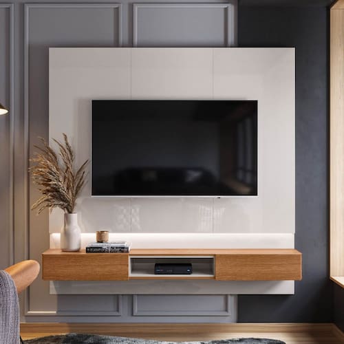 Painel Paris para TV até 70 polegadas com 2 Gavetas Iluminação em fita de LED Off White/Jequitibá - Lukaliam