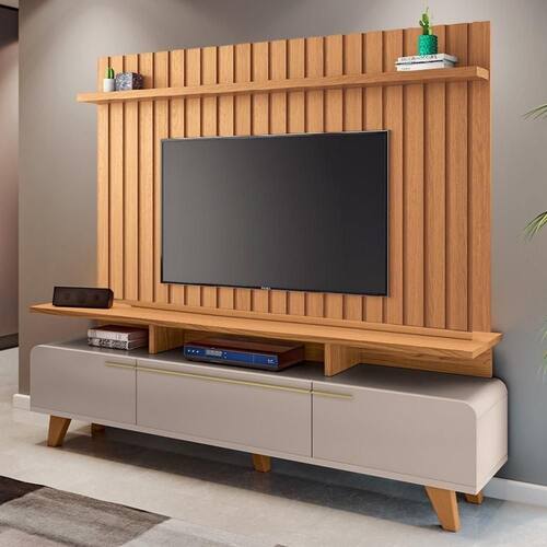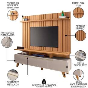 Com um design moderno e sofisticado que mescla o estilo orgânico com cantos arredondados. o Rack Bancada possui três portas basculantes com pistão a gás, que garantem mais praticidade e na hora de guardar seus objetos. Os puxadores metálicos em tom dourado dão um toque de charme e requinte ao móvel, que conta ainda com pés de madeira maciça com acabamento envernizado. A bancada é produzida em MDP e MDF de 25mm e 15mm, materiais resistentes e duráveis. O Painel Para é um show à parte, com um ripado de que confere mais beleza e sofisticação ao ambiente. O painel possui uma prateleira com espessura de 37mm, ideal para apoiar seus objetos decorativos ou eletrônicos. Além disso, o painel tem uma montagem , que permite duas opções de utilização invertendo sua instalação na parede para deixar a prateleira superior ou inferior. O painel é feito em MDP e MDF de 37mm e 15mm, e é ideal para compor o ambiente com a bancada. Você vai se surpreender com a qualidade e o estilo desse conjunto!