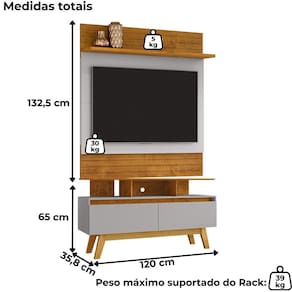 Painel Suspenso Angra e Rack Bancada Rubi, design funcional com detalhes que valorizam o ambiente. Estrutura em MDP/MDF com acabamento em pintura UV texturizada. O conjunto é composto por frisos decorativos, painéis sobrepostos (MDF 15mm), prateleira superior (MDP 25mm), portas basculantes com dobradiças metálicas, detalhes chanfrados, nichos decorativos funcionais, passa-fios e pés em madeira maciça (Pinus). Painel suporta TVs de até 50 polegadas. Este produto será entregue em 2 volumes.