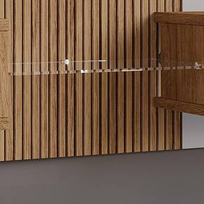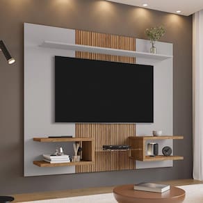 A composição conta com área central reforçada para fixação da TV, além de prateleira superior funcional que permite acomodar objetos decorativos, luminárias leves, quadros e itens de uso cotidiano. Os detalhes usinados na superfície tornam o painel ainda mais sofisticado, acrescentando textura e um toque contemporâneo ao conjunto.