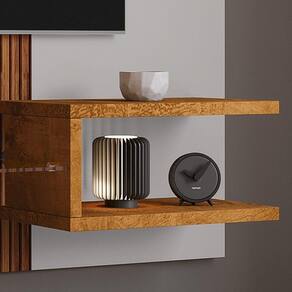 A composição conta com área central reforçada para fixação da TV, além de prateleira superior funcional que permite acomodar objetos decorativos, luminárias leves, quadros e itens de uso cotidiano. Os detalhes usinados na superfície tornam o painel ainda mais sofisticado, acrescentando textura e um toque contemporâneo ao conjunto.