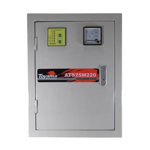 Painel ATS25T220 Trifásico Toyama, 220V, com cabo de conexão, apto para operar com SmartGen, detecta a interrupção ou a falta de energia elétrica e envia sinal de acionamento ou desligamento do grupo gerador TDMG25SSE3D, que assume ou cessa, então a alimentação da carga requerida.