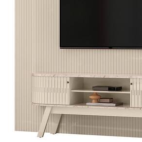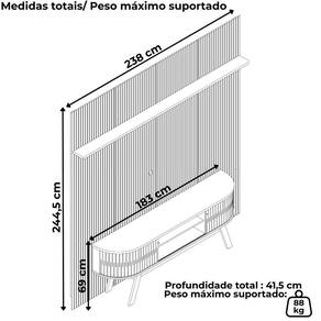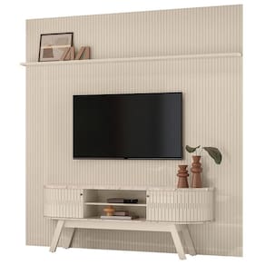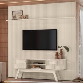 Painel e Rack Bancada New Laguna, funcionalidade e sofisticação para transformar sua sala! Composto por Painel do chão ao teto (efeito ripado em baixo relevo) e Rack Bancada. Estrutura em MDP/MDF (base MDP 15 e 25 mm/ portas e painéis MDF 12 mm) e acabamento em pintura UV texturizada. Conta com prateleira superior, 2 portas flexiveis de correr com frisos vazados, trilho plástico e puxadores em poliestireno. Pés retrô, suporta TVs de até 75 polegadas e internamente oferece uma prateleira funcional e passa-fios central. Este produto chegará em sua casa separado em 3 volumes.