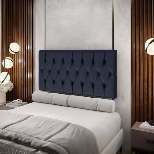 Características do Produto: Madeira de eucalipto proveniente de reflorestamento Fixação com grampos galvanizados Espuma Poliuretano D20 Revestimento: Couro Cor: Azul Tamanho: Casal padrão Fixação na parede via suportes metálicos. Embalagem: papelão ondulado, malha e plástico Garantia de 3 meses contra defeitos de fábrica.