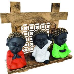Este Kit contém 4 peças: - 3 Mini Buda Cores de 10 cm de altura - 1 Aparador exotérico vazado no tamanho de 18cm de altura x 20cm de largura x 7cm de profundidade