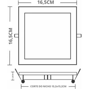 Características Técnicas: Tensão Autovolt (100-240V) Fluxo luminoso: 720lm Potência: 12W Aplicação: Embutir Frequência 50/60Hz Fator de potência 0,5 Ângulo abertura facho 120º Vida útil 20000h Temperatura operação -10°C A 40°C Material predominante: Plástico Garantia 1 Ano ( fornecedor ) Dimensões: 165 x 165 x 28mm Nicho: 152 x 152mm
