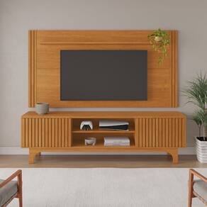 Características: Marca: JCM Movelaria Modelo: Conjunto Trunfo Mesclado de MDP e MDF Detalhe ripado Prateleira de 25mm Pés MDF Usinados Portas do rack de correr ripadas Espaço para TV: 1760mm x 950mm (LxA) Recomenda-se TV até 70 Polegadas Painel acompanha suporte TV